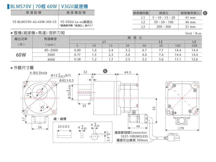 左右滑動看表格馬達型號表示 YZ BLMS70V A2 60W 30S CS YZ公司 BLMS系列 無刷馬達