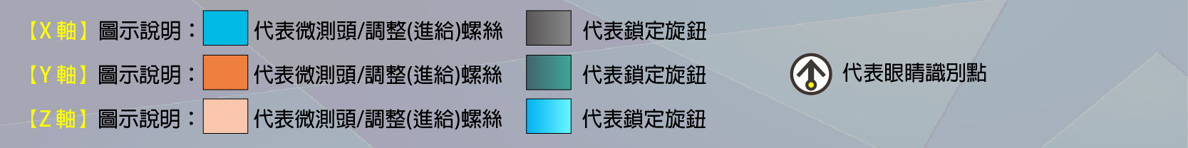 左右滑動看表格①MCS-②25③X④C⑤L-②25③Y④C⑤L-②25③Z④C⑤L⑥U X軸 Y軸 Z軸 ①手動軌道模式 ②台面尺寸 ③傳導方向 ④ 微測位置 ⑤鎖定旋鈕位置 ⑥Z軸移動方向